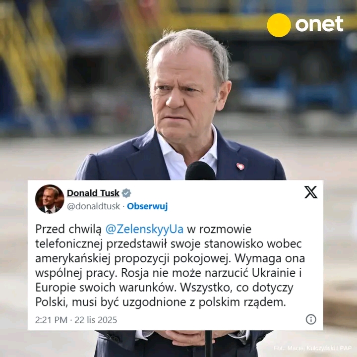 “Przed chwilą Wołodymyr Zełenski w rozmowie telefonicznej przedstawił swoje stanowisko wobec amerykańskiej propozycji pokojowej. Wymaga ona wspólnej pracy. Rosja nie może narzucić Ukrainie i Europie swoich warunków. Wszystko, co dotyczy Polski, musi być uzgodnione z polskim rządem” — napisał w sobotę po południu na portalu X Donald Tusk.