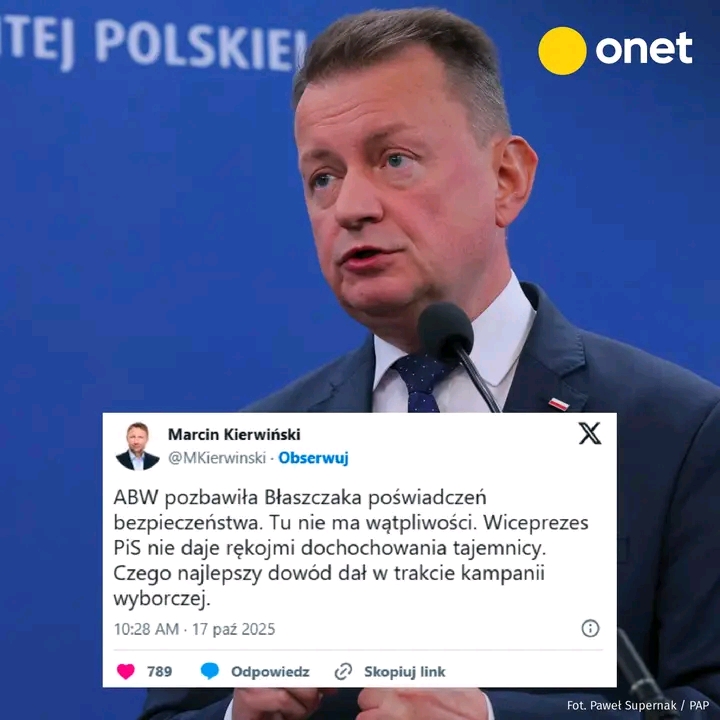 Agencja Bezpieczeństwa Wewnętrznego pozbawiła posła Prawa i Sprawiedliwości Mariusza Błaszczaka poświadczeń bezpieczeństwa — poinformował szef MSWiA Marcin Kierwiński. Polityk Zjednoczonej Prawicy skomentował działania ABW, mówiąc o “podatności na szantaż”.