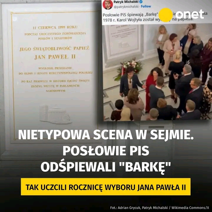 Posłowie Prawa i Sprawiedliwości zorganizowali w Sejmie nietypową uroczystość. Parlamentarzyści zgromadzili się pod tablicą upamiętniającą Jana Pawła II i odśpiewali “Barkę”. W ten sposób uczcili 47. rocznicę wyboru Polaka na papieża. Sieć obiegło nagranie ukazujące całą sytuację.