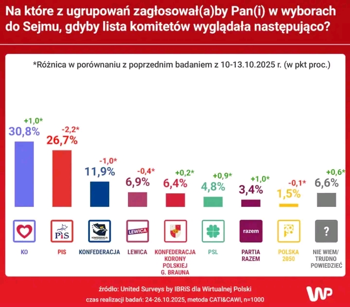 KO zyskała 1 punkt procentowy poparcia w stosunku do poprzedniego badania (z 10-13 października). Partia Donalda Tuska, choć wygrałaby wybory, nie miałaby szans na samodzielne rządzenie.