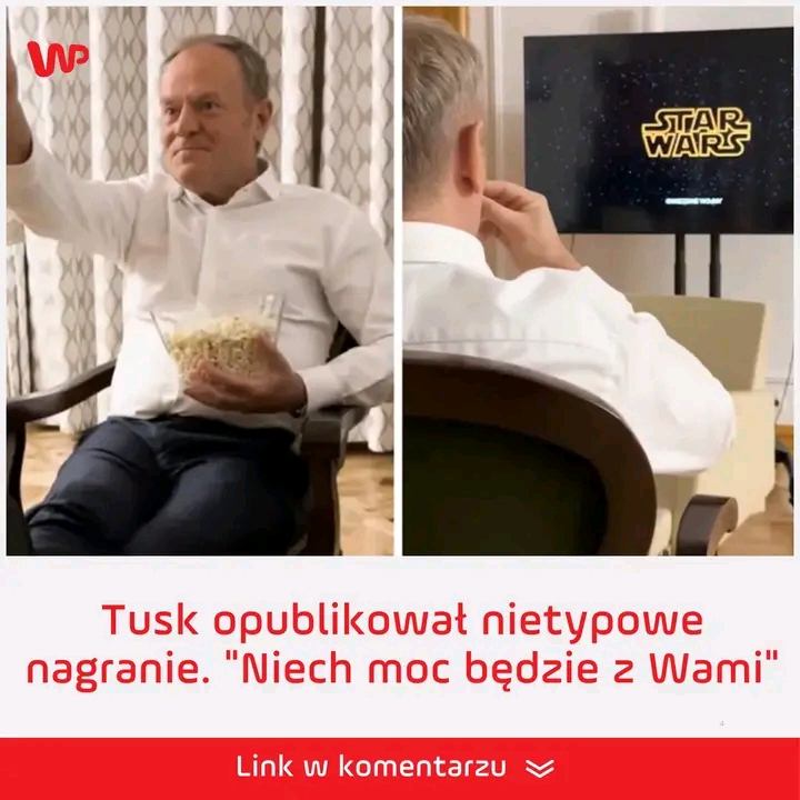 Donald Tusk opublikował nagranie, w którym mówi, że jego ulubionym filmem jest “Powrót Jedi”. Na filmiku Tusk siedzi przed telewizorem z nogami na fotelu. W ręku trzyma miskę pełną popcornu. Nie brakuje interpretacji, że nagranie i jego zawartość to sygnał do opozycji i nawiązanie do rozliczeń rządów PiS-u.