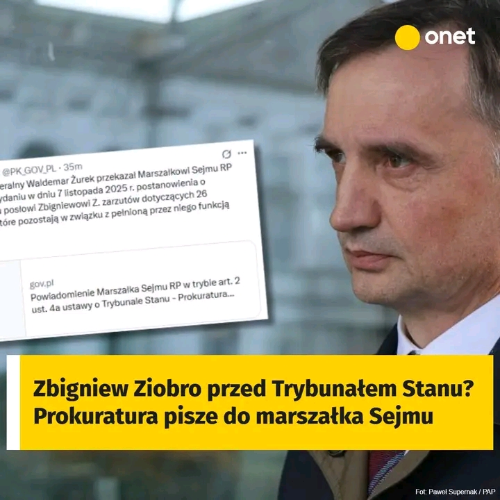 “Prokurator Generalny Waldemar Żurek przekazał Marszałkowi Sejmu RP informację o wydaniu w dniu 7 listopada 2025 r. postanowienia o przedstawieniu posłowi Zbigniewowi Z. zarzutów dotyczących 26 przestępstw, które pozostają w związku z pełnioną przez niego funkcją Ministra Sprawiedliwości Prokuratora Generalnego” — czytamy w oficjalnym komunikacie Prokuratury Krajowej.
